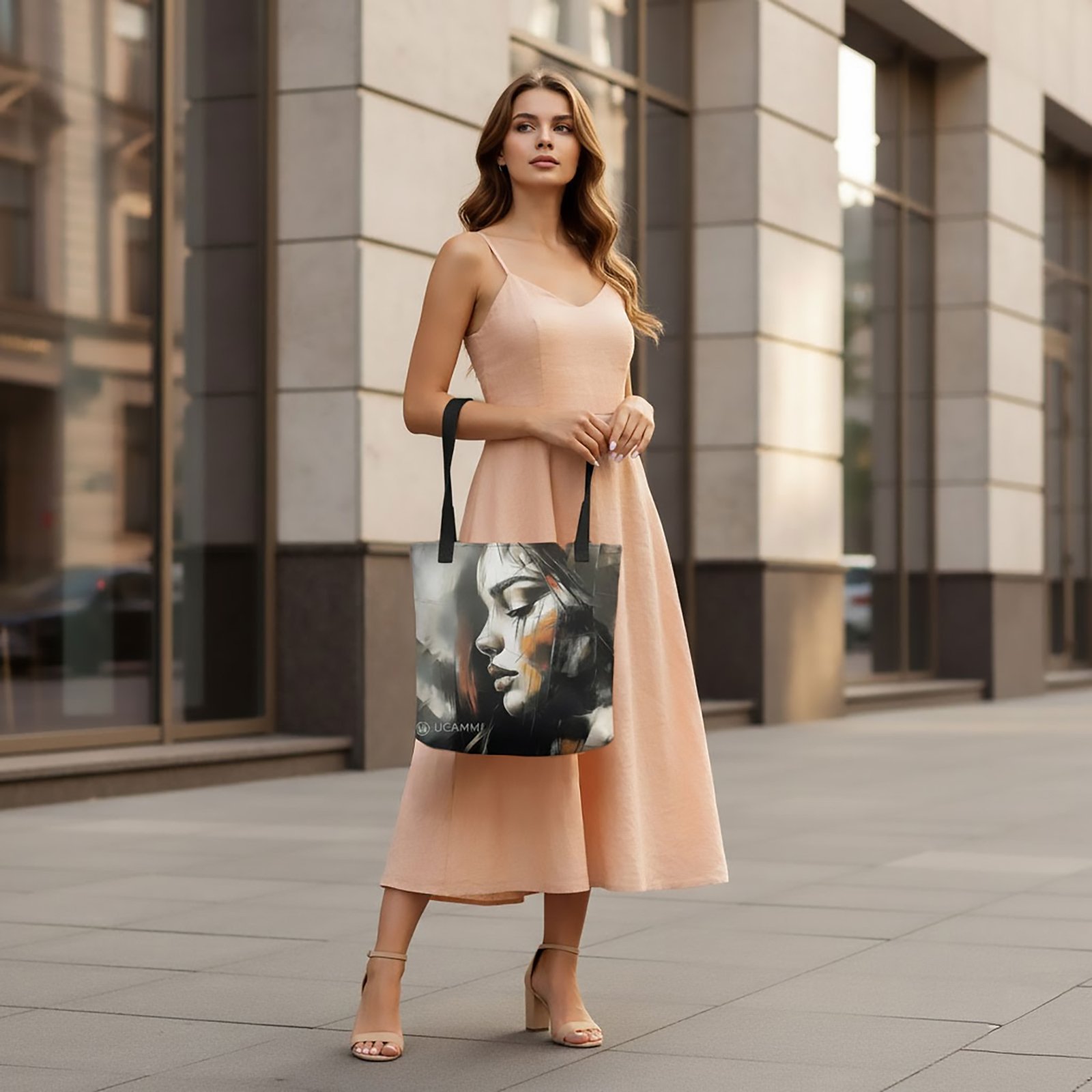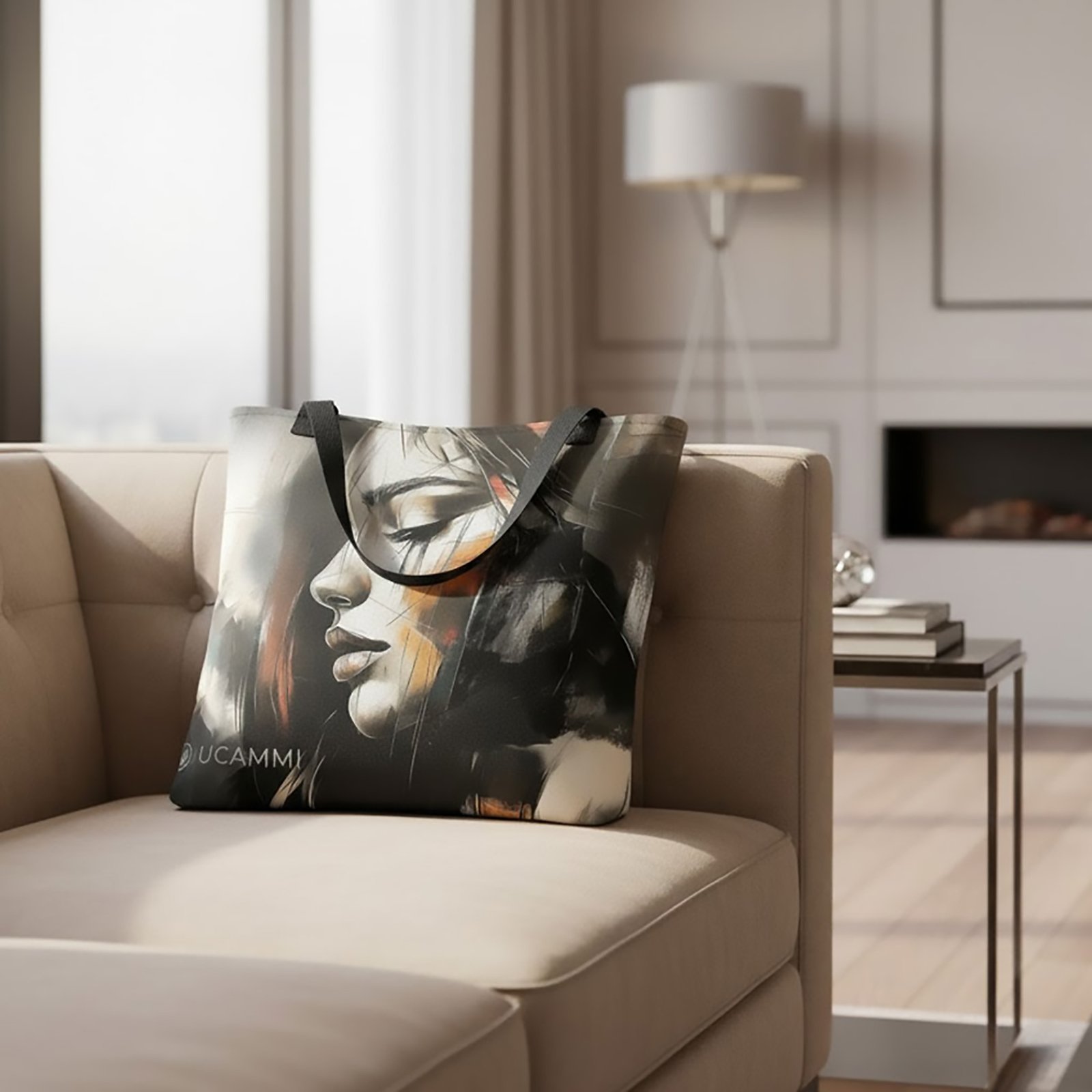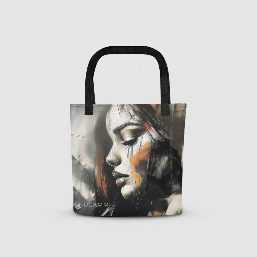 The UCAMMI Atelier Soft Neutral Portrait Canvas Tote Bag is designed for women who feel deeply and express themselves through art. This premium 15″×15″ medium tote bag brings modern emotional artistry into everyday fashion, featuring a bold abstract female portrait on the front and a refined UCAMMI pattern on the back for a timeless double-sided design.