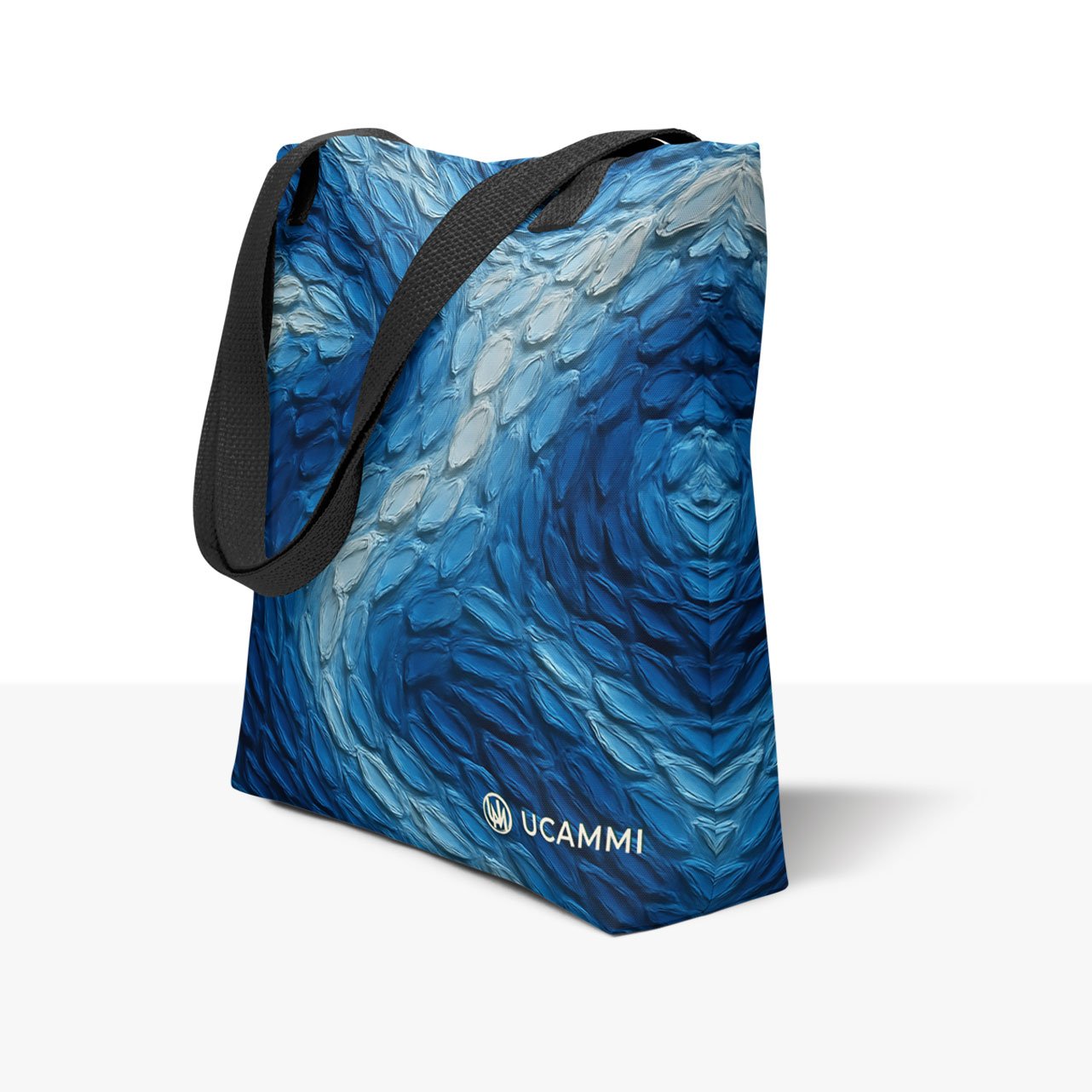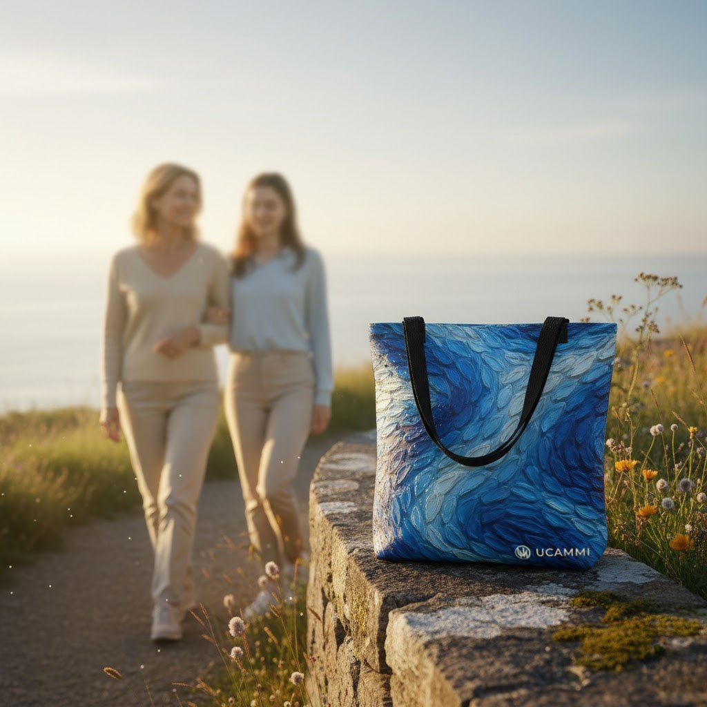 The Compassion Waves Canvas Tote features flowing blue textures that move like soft, gentle currents. The blend of deep ocean tones and lighter strokes creates a calm, comforting rhythm that feels quietly supportive. The design expresses compassion in an understated way—warm, subtle, and naturally uplifting. The same artwork appears on both sides for a seamless, minimal style.