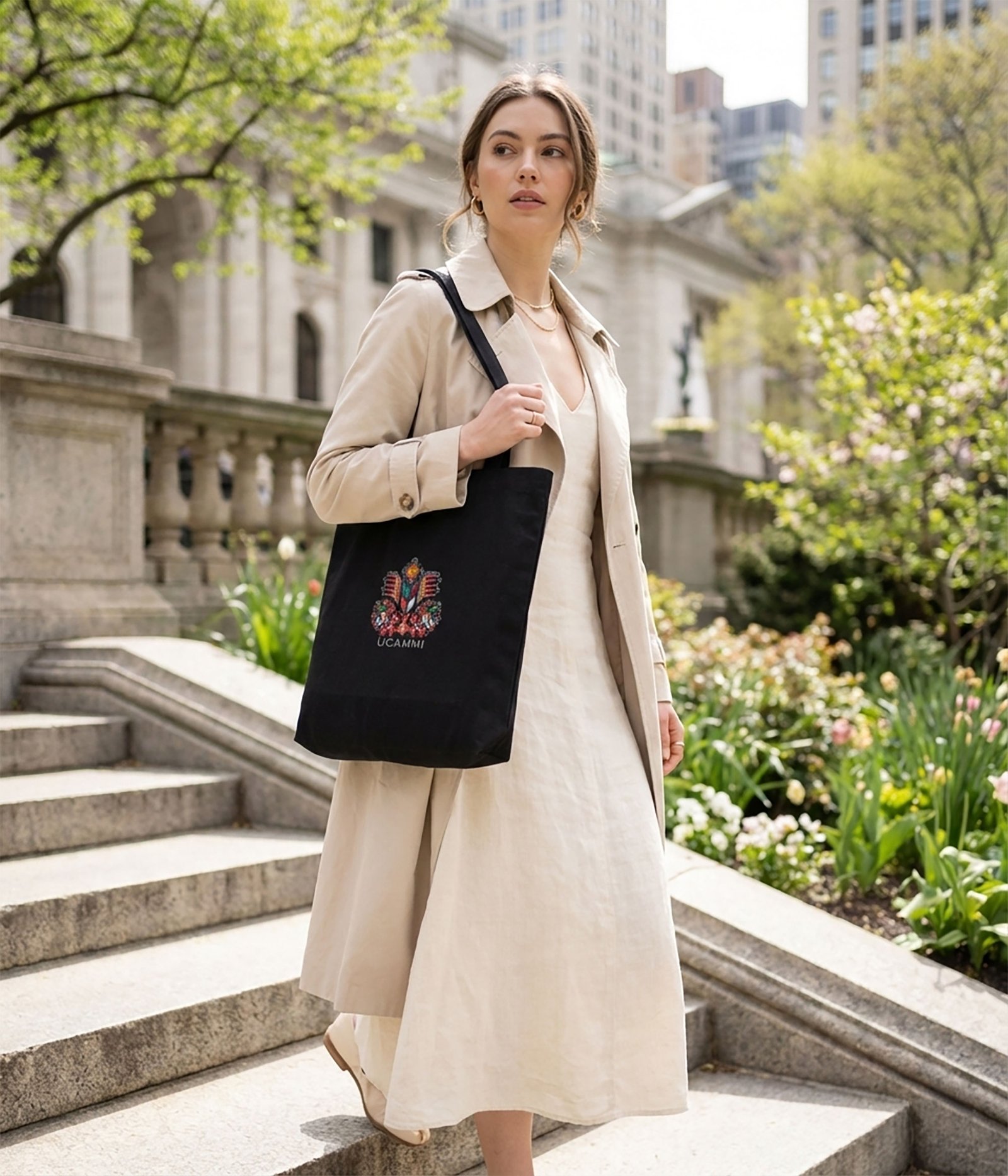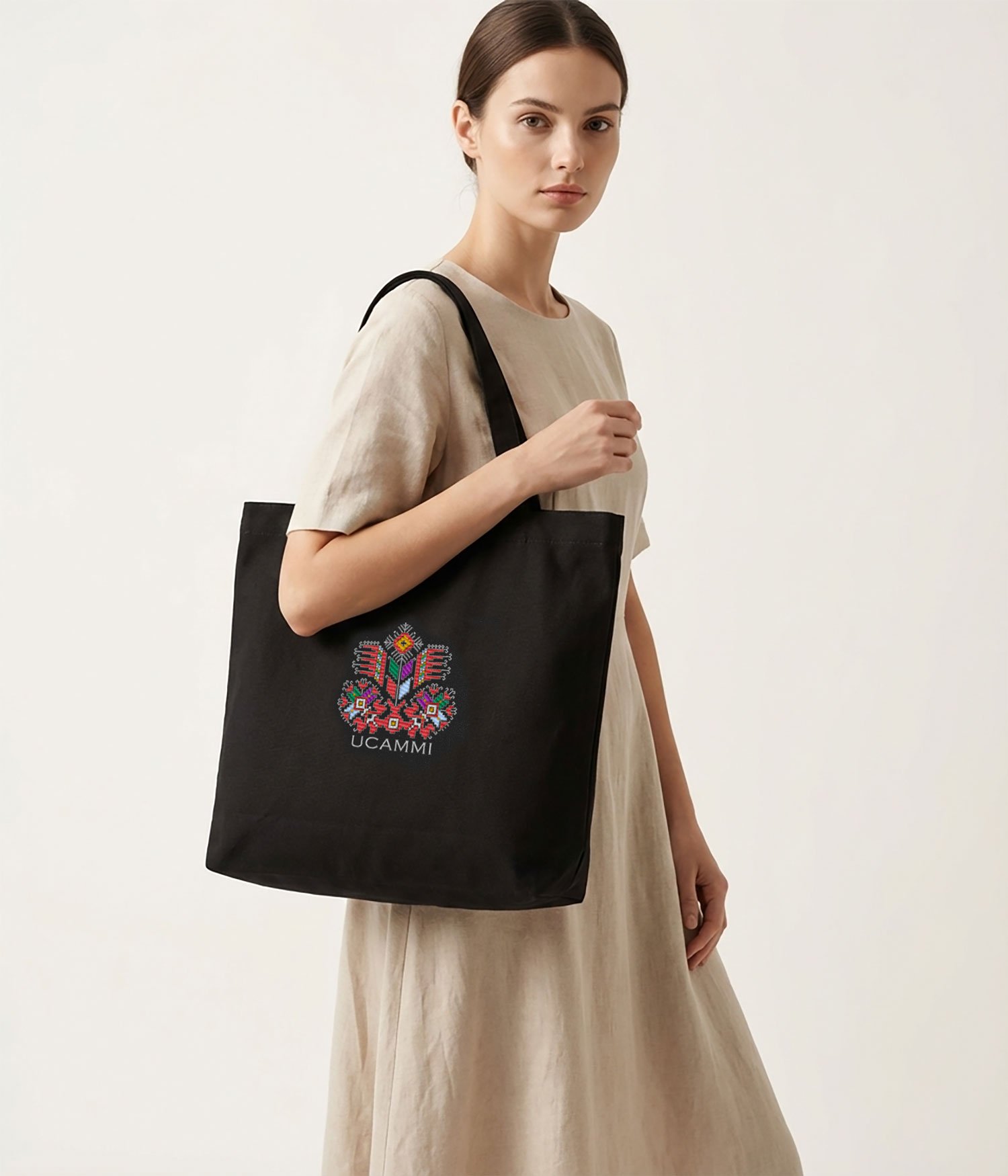 This embroidered canvas tote bag features The Goddess motif, inspired by traditional embroidery symbolism. Representing creation, intuition, protection, and nurturing feminine energy, the Ucammi design reflects a powerful balance between the spiritual and the material. The premium detailed stitching brings depth and presence to the canvas, creating a tote bag that feels both contemporary and deeply rooted in tradition.